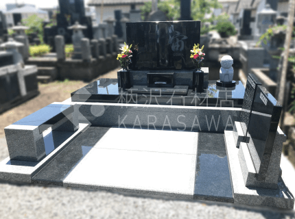ベンチ、お地蔵さんを追加し2世帯で使用するため墓誌を2枚配置しました。- 面積
