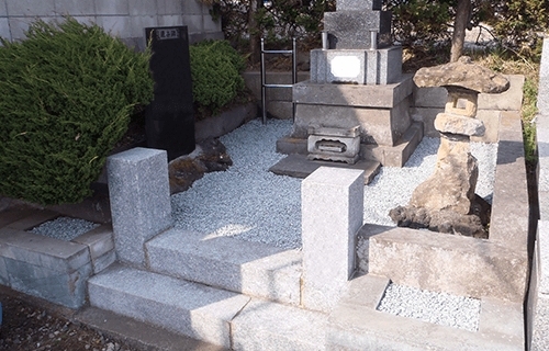 HOME WEB展示場 リフォーム 砂利の入れ替え 砂利の入れ替え リフォーム 墓所内の古くなってしまった砂利を撤去し、新たな砂利(主に当社お勧めの緑砂利)を敷き詰めます。施工の際は一緒に草止めシートの敷き詰めもお勧めしています。 税込参考価格 12,100円/㎡ お問合せ ※類似品の制作・販売は意匠権侵害並びに不正競争行為に該当する恐れがありますのでご注意ください。 ※墓石参考価格には基礎工事、石塔墓誌本体、設置費、字彫り等含まれます。 ※石材は当社が自信を持ってお勧めする世界中の石から選んでいただけます。 ※建立工事は敷地面積、立地条件、特種基礎等により価格に変動がありますのでお問い合わせください。 一覧に戻る